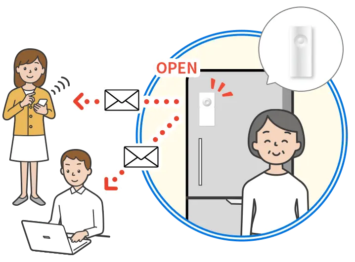 センサーは両面シールで貼り付けるだけの手軽さです。家族がメールチェックしなければならないものの、親の安否をしっかり確認できます。また、もしものときは駆けつけオプションも利用可能です。
